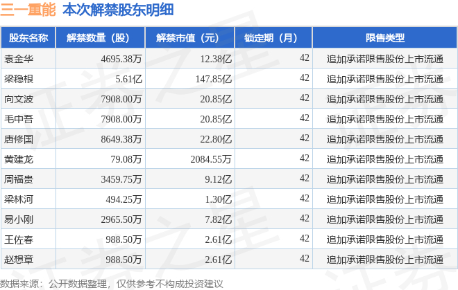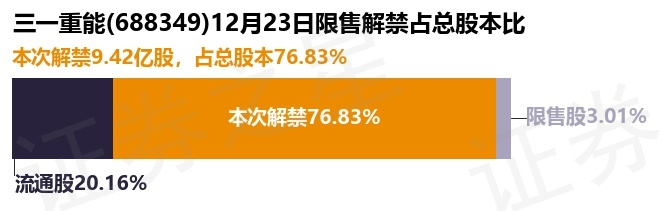 证券之星消息,根据市场公开信息整理,三一重能(688349)于12月23日将有9.42亿股限售股份解禁,为公司追加承诺限售股份上市流通,占公司总股本76.83%。(本次数据根据历史公告整理得出,实际情况以上市公司最新公告为准)最近一年内,该股累计解禁5896.03万股,占总股本的4.81%。本次解禁后,公司还有3692.0万股限售股份,占总股本3.01%。具体如下图所示: