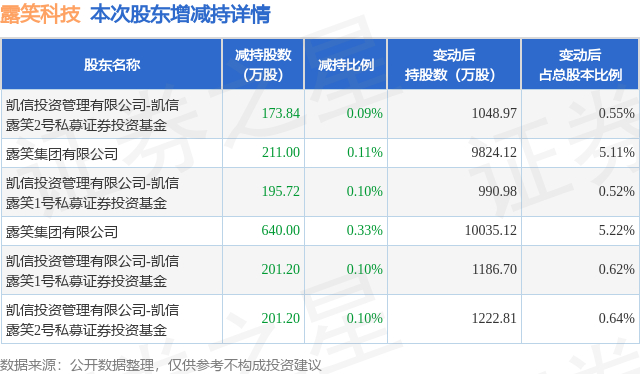 证券之星消息,12月23日露笑科技发布公告《露笑科技:关于持股5%以上股东及其一致行动人减持股份比例触及1%整数倍的公告》,其股东凯信投资管理有限公司-凯信露笑2号私募证券投资基金、露笑集团有限公司、凯信投资管理有限公司-凯信露笑1号私募证券投资基金于2025年12月22日至2025年12月23日间合计减持1622.96万股,占公司目前总股本的0.8439%,变动期间该股股价下跌1.03%,截止12月23日收盘报7.71元。
