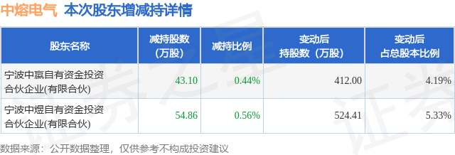 证券之星消息,12月23日中熔电气发布公告《中熔电气:关于实际控制人的一致行动人股份减持计划实施完毕的公告》,其股东宁波中嬴自有资金投资合伙企业(有限合伙)、宁波中煜自有资金投资合伙企业(有限合伙)于2025年11月6日至2025年12月22日间合计减持97.96万股,占公司目前总股本的0.9964%,变动期间该股股价下跌10.79%,截止12月22日收盘报109.19元。