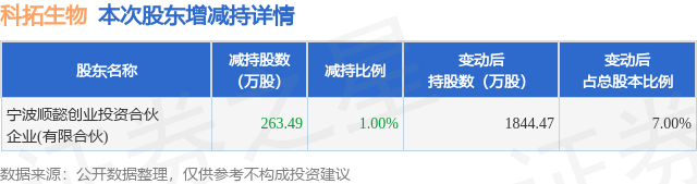 证券之星消息,12月23日科拓生物发布公告《科拓生物:关于5%以上股东减持股份触及1%整数倍的公告》,其股东宁波顺懿创业投资合伙企业(有限合伙)于2025年12月18日至2025年12月22日间合计减持263.49万股,占公司目前总股本的1.0%,变动期间该股股价上涨2.75%,截止12月22日收盘报16.81元。