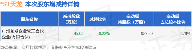 证券之星消息,12月23日*ST天龙发布公告《*ST天龙:关于持股5%以上股东股份减持完成的公告》,其股东广州龙朔企业管理合伙企业(有限合伙)于2025年10月22日至2025年12月22日间合计减持45.03万股,占公司目前总股本的0.2246%,变动期间该股股价上涨0.17%,截止12月22日收盘报5.97元。