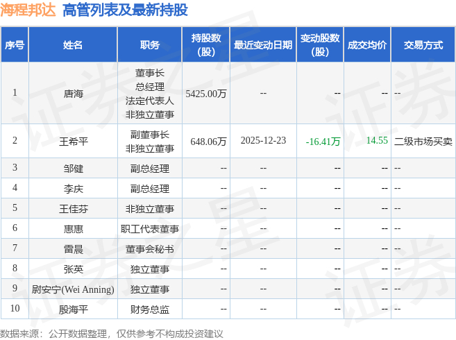 海程邦达近半年内的董监高及核心技术人员增减持详情如下: