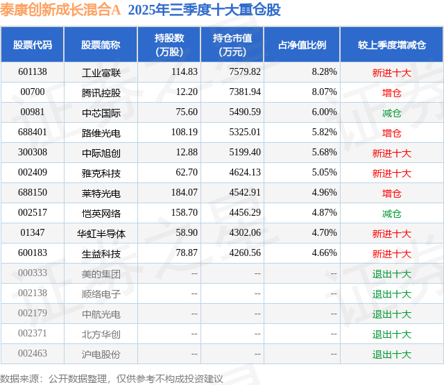泰康创新成长混合A的前十大重仓股如下: