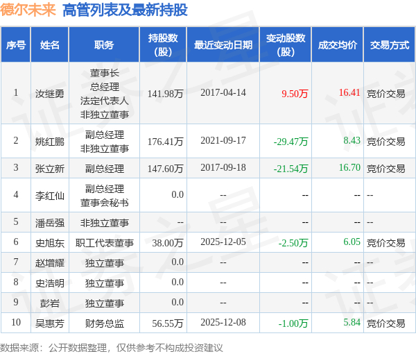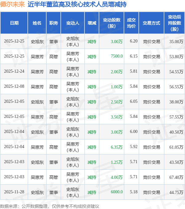 德尔未来近半年内的董监高及核心技术人员增减持详情如下: