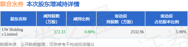 证券之星消息,12月29日联合水务发布公告《联合水务:持股5%以上股东权益变动触及1%刻度暨减持股份实施结果公告》,其股东UW Holdings Limited于2025年12月19日至2025年12月26日间合计减持372.33万股,占公司目前总股本的0.8798%,变动期间该股股价上涨0.0%,截止12月26日收盘报9.65元。