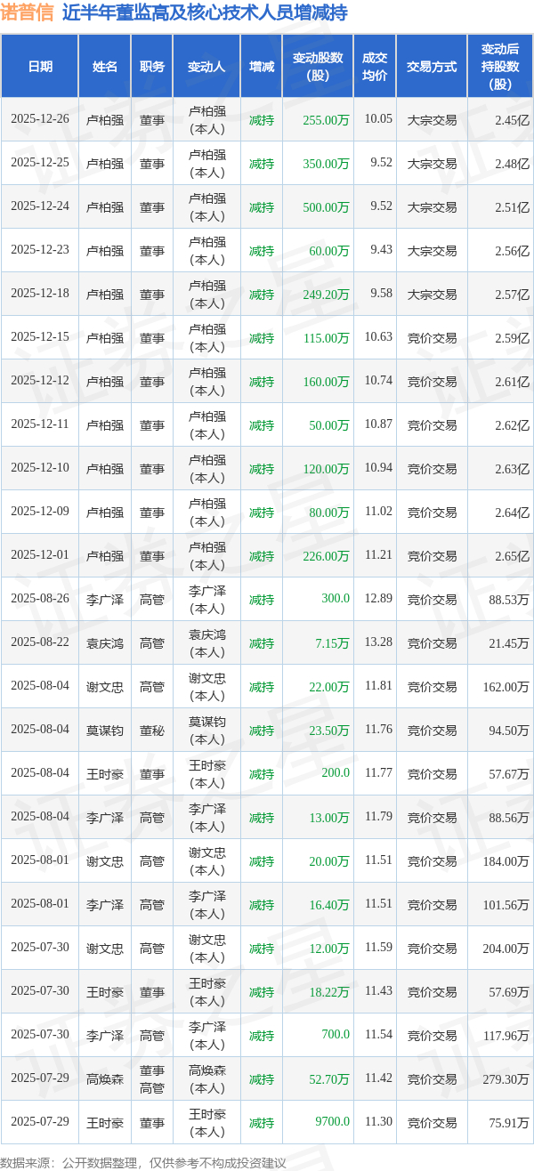 诺普信近半年内的董监高及核心技术人员增减持详情如下: