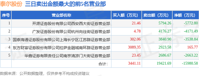 证券之星消息,沪深交易所2025年12月30日公布的交易公开信息显示,泰尔股份(002347)因日振幅值达到15%的前5只证券,连续三个交易日内,涨幅偏离值累计达到20%的证券,日换手率达到20%的前5只证券登上龙虎榜。此次是近5个交易日内第2次上榜。