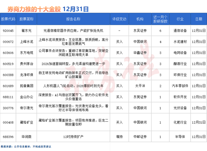 蘅东光最受券商关注,近一个月获山西证券、中国银河、华金证券、华源证券、开源证券等6份券商研报关注,位居12月31日券商力推股榜首。