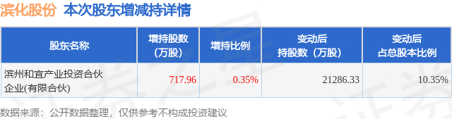 证券之星消息,1月4日滨化股份发布公告《滨化股份:滨化股份关于第一大股东增持公司股份的结果公告》,其股东滨州和宜产业投资合伙企业(有限合伙)于2025年11月5日至2025年12月31日间合计增持717.96万股,占公司目前总股本的0.3491%,变动期间该股股价下跌0.7%,截止12月31日收盘报4.24元。