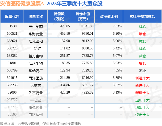 根据2025基金Q3季报公募基金重仓股数据,重仓该股的公募基金共4家,其中持有数量最多的公募基金为安信基金的安信医药健康股票A。安信医药健康股票A目前规模为4.13亿元,最新净值1.3606(12月31日),较上一交易日下跌0.82%,近一年上涨49.3%。该公募基金现任基金经理为池陈森。