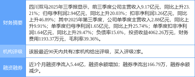 2025年10月31日,国金证券研究员舒思勤,方丽,洪希柠,夏昌盛,李阳,马居东发布了对四川双马的研报《投资收益表现亮眼,前三季度业绩同比双位数增长》,该研报对四川双马给出“买入”评级。证券之星数据中心根据近三年发布的研报数据计算,该研报作者对此股的盈利预测准确度为68.98%。