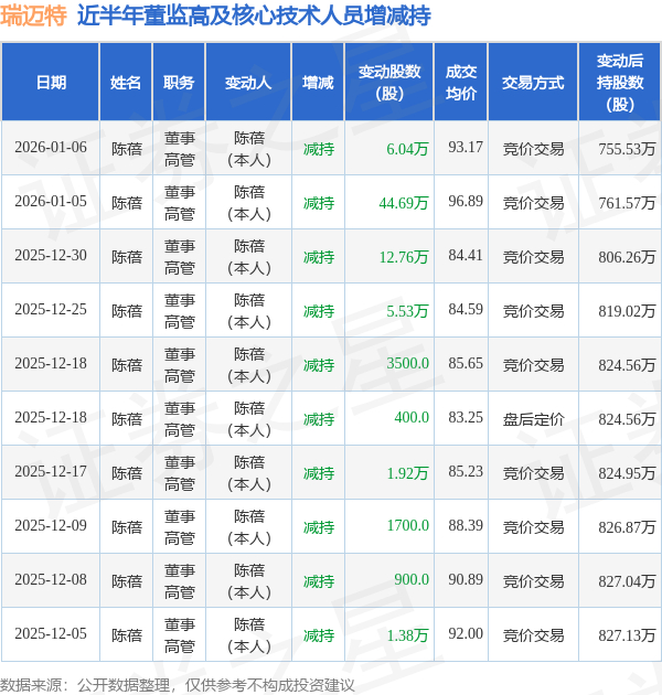 瑞迈特近半年内的董监高及核心技术人员增减持详情如下:
