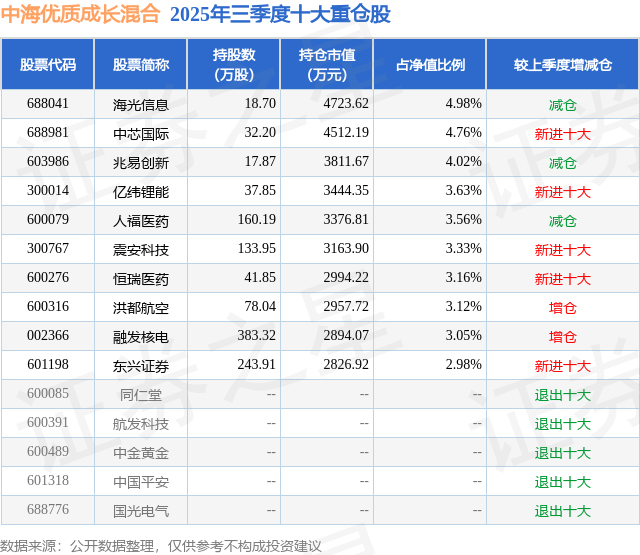 根据2025基金Q3季报公募基金重仓股数据,重仓该股的公募基金共1家,其中持有数量最多的公募基金为中海基金的中海优质成长混合。中海优质成长混合目前规模为9.49亿元,最新净值0.345(1月7日),较上一交易日上涨1.35%,近一年上涨21.52%。该公募基金现任基金经理为许定晴。