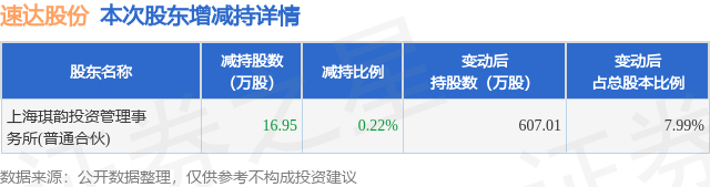 证券之星消息,1月9日速达股份发布公告《速达股份:关于持股5%以上股东减持股份触及1%整数倍的公告》,其股东上海琪韵投资管理事务所(普通合伙)于2026年1月8日合计减持16.95万股,占公司目前总股本的0.223%,变动期间该股股价下跌0.35%,截止1月8日收盘报40.0元。