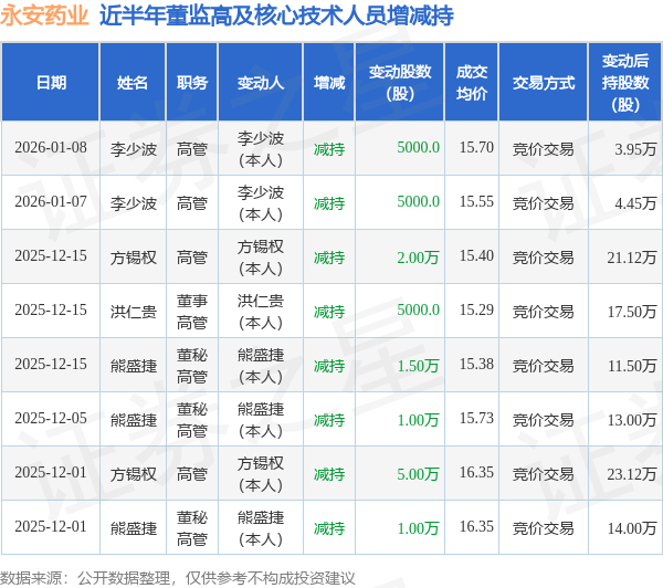 永安药业近半年内的董监高及核心技术人员增减持详情如下: