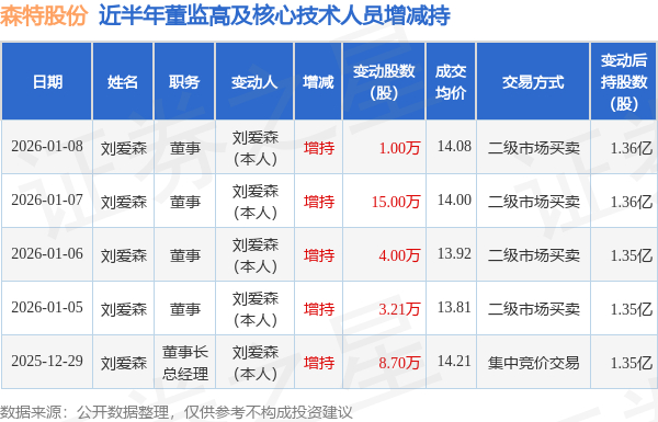 证券之星消息,根据1月12日市场公开信息、上市公司公告及交易所披露数据整理,森特股份(603098)最新董监高及相关人员股份变动情况:2026年1月7日至2026年1月8日公司董事刘爱森共增持公司股份16.0万股,占公司总股本为0.0297%。变动期间公司股价上涨0.71%,1月8日当日收盘报14.09元。
