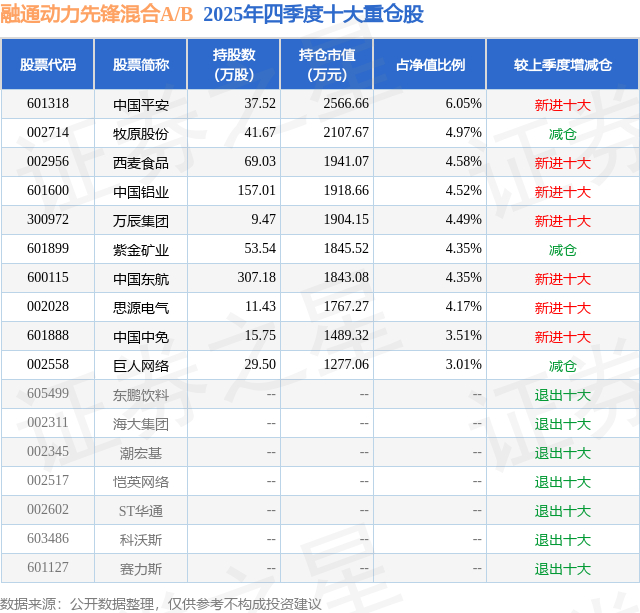 融通动力先锋混合A/B的前十大重仓股如下: