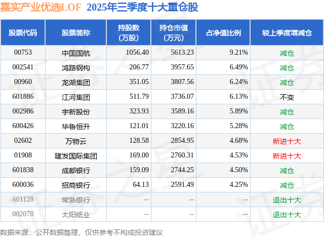 嘉实产业优选LOF的前十大重仓股如下: