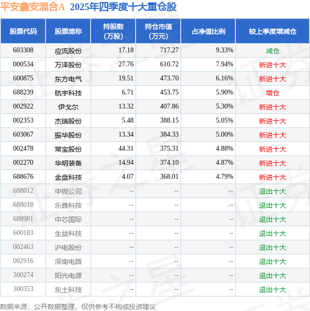 平安鑫安混合A的前十大重仓股如下: