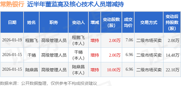 证券之星消息,根据1月20日市场公开信息、上市公司公告及交易所披露数据整理,常熟银行(601128)最新董监高及相关人员股份变动情况:2026年1月19日公司高级管理人员程鹏飞共增持公司股份2.0万股,占公司总股本为0.0006%。变动期间公司股价上涨1.58%,1月19日当日收盘报7.08元。