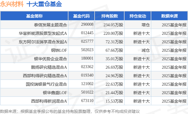 重仓永兴材料的前十大公募基金请见下表:
