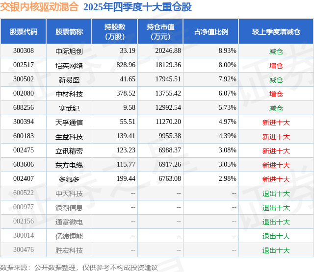 交银内核驱动混合的前十大重仓股如下: