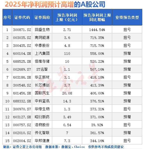 此外,南网能源、中泰股份、上汽集团、佰维存储、ST远智等5只股预计2025年净利润上限增幅也在500%以上。华正新材、长芯博创、国联民生、中科蓝汛等多股净利润同样有望翻数倍增长。