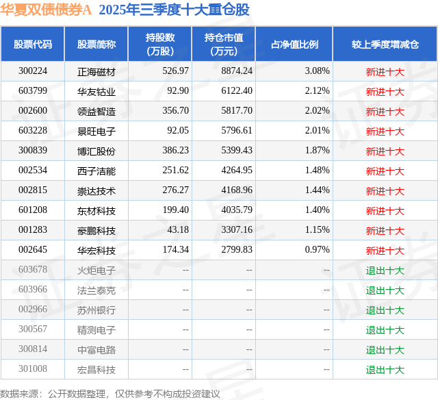 根据2025基金Q3季报公募基金重仓股数据,重仓该股的公募基金共3家,其中持有数量最多的公募基金为华夏基金的华夏双债债券A。华夏双债债券A目前规模为19.09亿元,最新净值2.2328(1月21日),较上一交易日上涨1.03%,近一年上涨22.63%。该公募基金现任基金经理为柳万军。柳万军在任的基金产品包括:华夏纯债债券A,管理时间为2017年9月8日至今,期间收益率为36.56%;华夏永康添福混合A,管理时间为2019年7月15日至今,期间收益率为92.37%;华夏鼎清债券A,管理时间为2020年12月3日至今,期间收益率为22.1%。