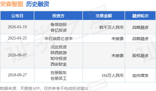 证券之星消息,根据天眼查APP于1月19日公布的信息整理,西安安森智能仪器股份有限公司战略融资,融资额数千万人民币,参与投资的机构包括鲁信创投,容亿投资。