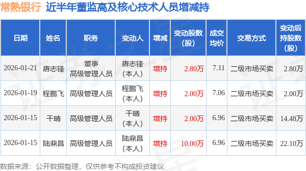 常熟银行近半年内的董监高及核心技术人员增减持详情如下: