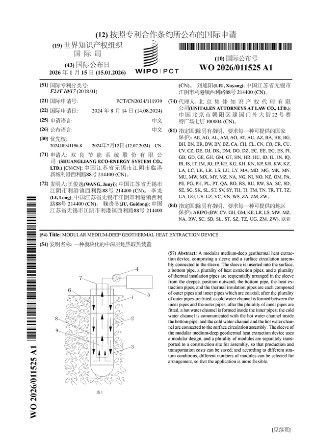 证券之星消息,根据企查查数据显示双良节能(600481)公布了一项国际专利申请,专利名为“一种模块化的中深层地热取热装置”,专利申请号为PCT/CN2024/111939,国际公布日为2026年1月15日。