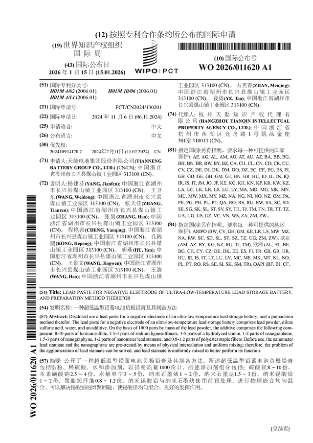 证券之星消息,根据企查查数据显示天能股份(688819)公布了一项国际专利申请,专利名为“一种超低温型铅蓄电池负极铅膏及其制备方法”,专利申请号为PCT/CN2024/130201,国际公布日为2026年1月15日。