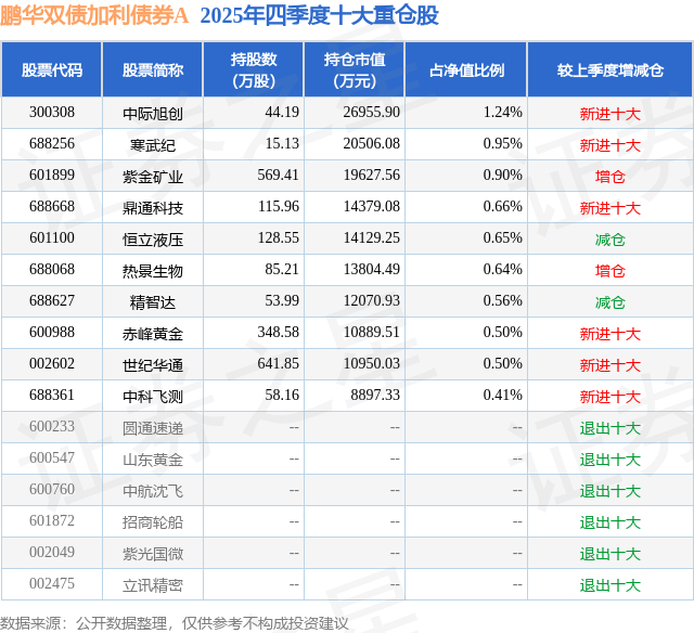 根据2025基金年报公募基金重仓股数据,重仓该股的公募基金共35家,其中持有数量最多的公募基金为鹏华基金的鹏华双债加利债券A。鹏华双债加利债券A目前规模为63.3亿元,最新净值2.1495(1月23日),较上一交易日上涨0.57%,近一年上涨21.71%。该公募基金现任基金经理为王石千。王石千在任的基金产品包括:鹏华丰利债券(LOF)A,管理时间为2018年4月12日至今,期间收益率为51.96%;鹏华可转债债券A,管理时间为2018年7月13日至今,期间收益率为150.76%;鹏华安惠混合A,管理时间为2020年7月24日至今,期间收益率为7.53%。