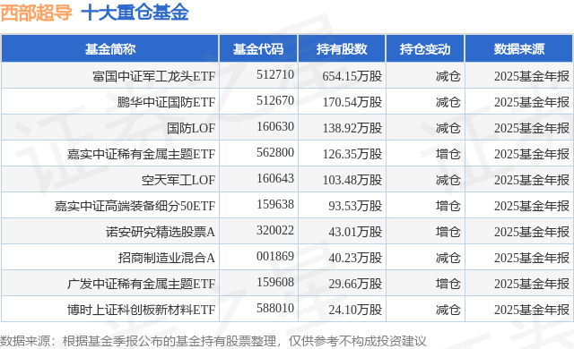 根据2025基金年报公募基金重仓股数据,重仓该股的公募基金共35家,其中持有数量最多的公募基金为富国基金的富国中证军工龙头ETF。富国中证军工龙头ETF目前规模为100.58亿元,最新净值0.9199(1月23日),较上一交易日上涨2.53%,近一年上涨58.17%。该公募基金现任基金经理为王乐乐 牛志冬。王乐乐在任的基金产品包括:富国中证消费50ETF,管理时间为2019年10月14日至今,期间收益率为15.39%;富国中证科技50策略ETF,管理时间为2019年11月15日至今,期间收益率为98.36%;富国中证科技50策略ETF联接A,管理时间为2020年2月20日至今,期间收益率为49.51%。牛志冬在任的基金产品包括:富国中证移动互联网指数(LOF)A,管理时间为2015年5月13日至今,期间收益率为6.73%;富国中证医药主题指数增强A,管理时间为2016年11月11日至今,期间收益率为49.67%;富国中证娱乐主题指数增强(LOF)A,管理时间为2017年3月13日至今,期间收益率为-8.96%;