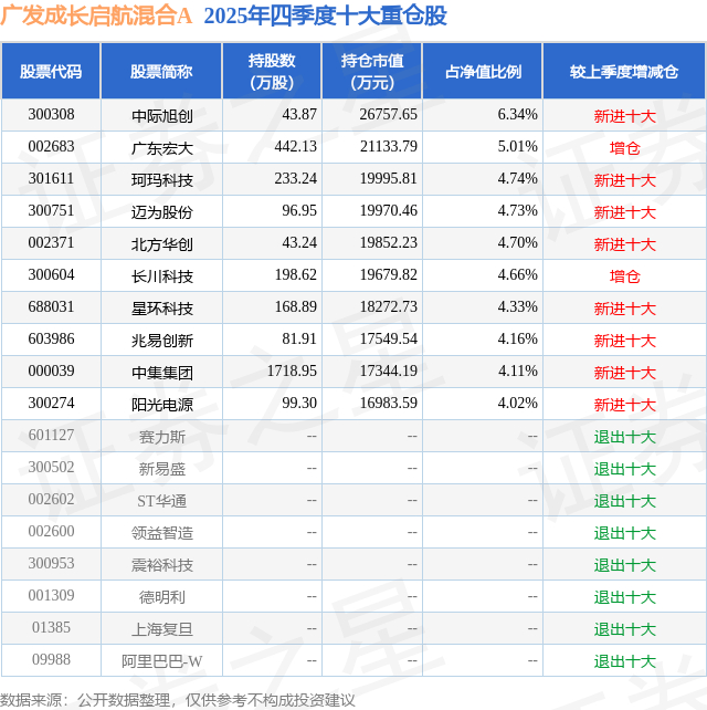 广发成长启航混合A的前十大重仓股如下: