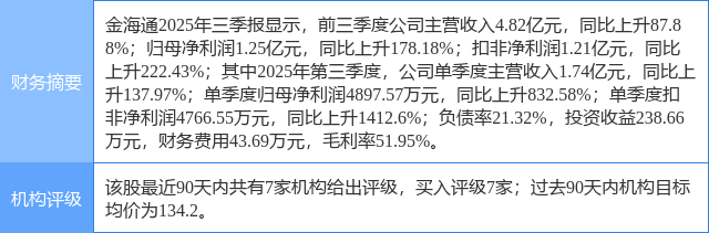 2025年11月18日,中邮证券研究员翟一梦,吴文吉发布了对金海通的研报《GPU算力需求持续提升》,该研报对金海通给出“买入”评级。研报中预计公司2025/2026/2027年分别实现收入6.6/8.9/11.5亿元,实现归母净利润分别为1.8/2.7/3.8亿元,维持“买入”评级。证券之星数据中心根据近三年发布的研报数据计算,该研报作者对此股的盈利预测准确度为56.03%。