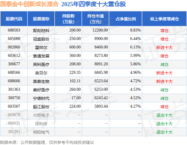根据2025基金年报公募基金重仓股数据,重仓该股的公募基金共6家,其中持有数量最多的公募基金为国泰基金的国泰金牛创新成长混合。国泰金牛创新成长混合目前规模为13.81亿元,最新净值1.304(1月26日),较上一交易日上涨0.0%,近一年上涨56.73%。该公募基金现任基金经理为程洲。程洲在任的基金产品包括:国泰聚信价值优势混合A,管理时间为2013年12月17日至今,期间收益率为433.92%;国泰大农业股票A,管理时间为2017年6月15日至今,期间收益率为98.5%;国泰聚优价值灵活配置混合A,管理时间为2017年11月15日至今,期间收益率为115.79%。