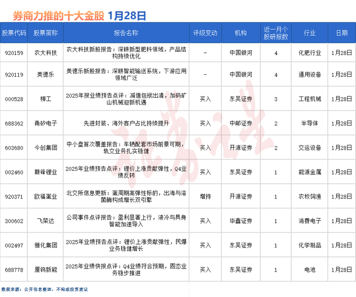 复合肥行业技术领军者——农大科技最受券商关注,近一个月获华金证券、开源证券、华源证券等4份券商研报关注,位居1月28日券商力推股榜首。