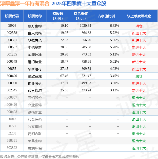 淳厚鑫淳一年持有混合的前十大重仓股如下: