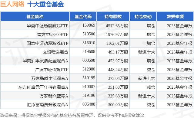 重仓巨人网络的前十大公募基金请见下表: