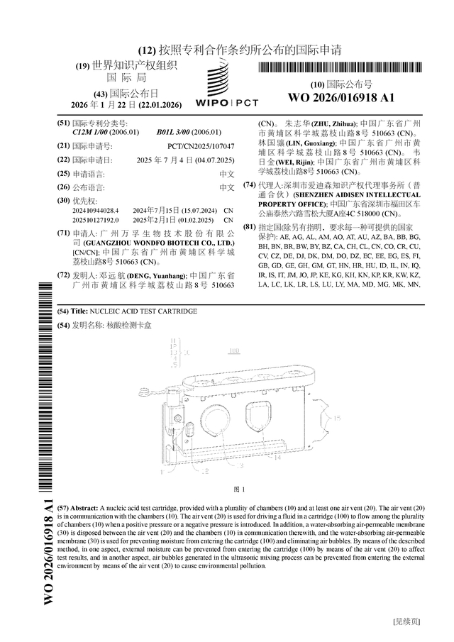 证券之星消息,根据企查查数据显示万孚生物(300482)公布了一项国际专利申请,专利名为“核酸检测卡盒”,专利申请号为PCT/CN2025/107047,国际公布日为2026年1月22日。