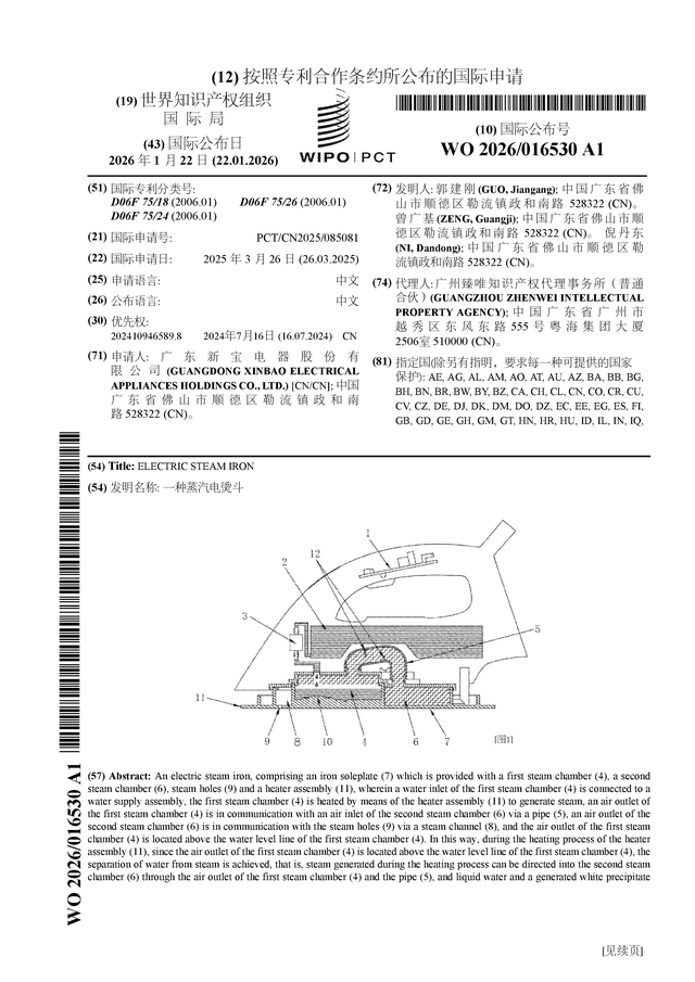 证券之星消息,根据企查查数据显示新宝股份(002705)公布了一项国际专利申请,专利名为“一种蒸汽电烫斗”,专利申请号为PCT/CN2025/085081,国际公布日为2026年1月22日。