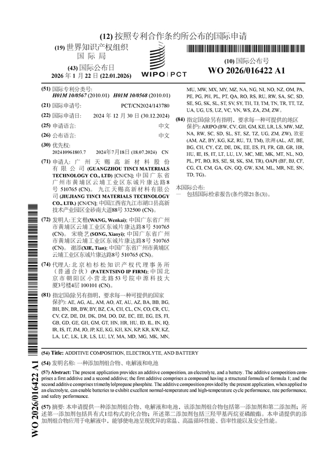 证券之星消息,根据企查查数据显示天赐材料(002709)公布了一项国际专利申请,专利名为“一种添加剂组合物、电解液和电池”,专利申请号为PCT/CN2024/143780,国际公布日为2026年1月22日。