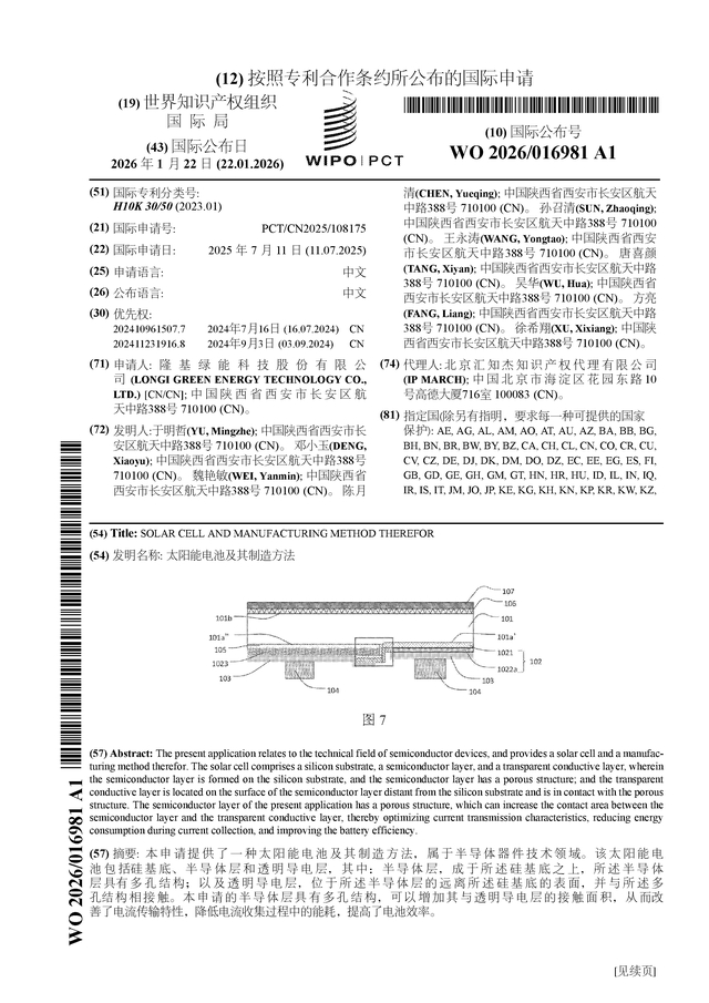 证券之星消息,根据企查查数据显示隆基绿能(601012)公布了一项国际专利申请,专利名为“太阳能电池及其制造方法”,专利申请号为PCT/CN2025/108175,国际公布日为2026年1月22日。