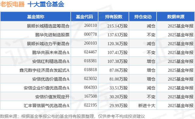 重仓老板电器的前十大公募基金请见下表: