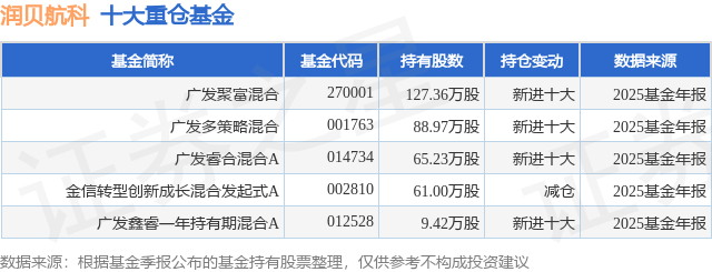 根据2025基金年报公募基金重仓股数据,重仓该股的公募基金共5家,其中持有数量最多的公募基金为广发基金的广发聚富混合。广发聚富混合目前规模为13.78亿元,最新净值1.1748(1月28日),较上一交易日下跌0.37%,近一年上涨19.76%。该公募基金现任基金经理为林英睿 陈宇庭。林英睿在任的基金产品包括:广发多策略混合,管理时间为2016年12月16日至今,期间收益率为103.94%;广发睿毅领先混合A,管理时间为2017年12月14日至今,期间收益率为165.57%;广发价值领先混合A,管理时间为2020年5月7日至今,期间收益率为82.92%。陈宇庭在任的基金产品包括:广发消费品精选混合A,管理时间为2024年3月29日至今,期间收益率为12.98%;广发消费智选混合A,管理时间为2025年12月25日至今,期间收益率为1.59%。