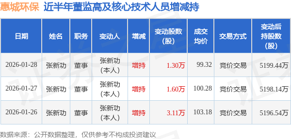 证券之星消息,根据1月29日市场公开信息、上市公司公告及交易所披露数据整理,惠城环保(300779)最新董监高及相关人员股份变动情况:2026年1月28日公司董事张新功共增持公司股份1.3万股,占公司总股本为0.0065%。变动期间公司股价下跌1.43%,1月28日当日收盘报99.7元。
