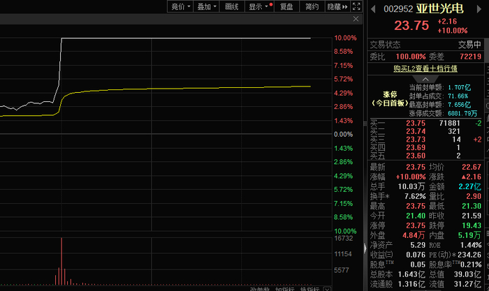 1月30,亚世光电(002952)股价盘中直线拉升,实现涨停。
