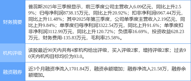 2025年11月1日,太平洋研究员周豫,张崴发布了对普蕊斯的研报《Q3业绩超预期,需求有望持续好转》,该研报对普蕊斯给出“买入”评级。研报中预计2025年-2027年公司营收为8.28/9.50/11.07亿元,同比增长3.02%/14.72%/16.57%;归母净利为1.28/1.44/1.64亿元,对应PE为32/29/25倍,持续给予“买入”评级。证券之星数据中心根据近三年发布的研报数据计算,该研报作者对此股的盈利预测准确度为67.97%。