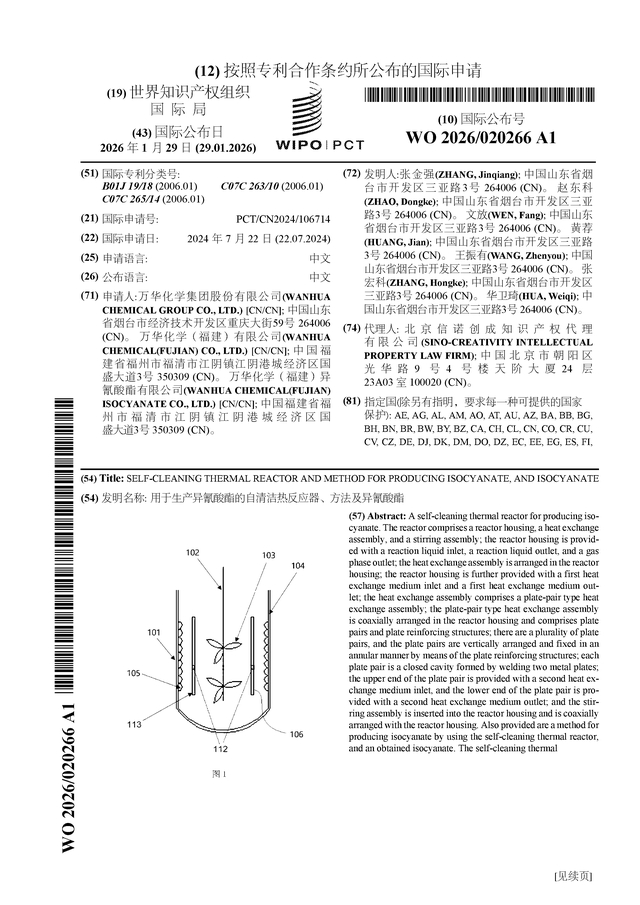 证券之星消息,根据企查查数据显示万华化学(600309)公布了一项国际专利申请,专利名为“用于生产异氰酸酯的自清洁热反应器、方法及异氰酸酯”,专利申请号为PCT/CN2024/106714,国际公布日为2026年1月29日。